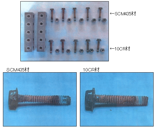 今回の遅れ破壊試験では、どちらの試料も試験条件を満足しており、特に問題はないと判断致します。ただ、比較試験という観点から判断いたしますと、下写真からも確認出来ますように、10CR材はSCM435材よりも腐食率が低く、また、増締め試験においても、10CR材は締め勝手が良く、その後の戻しトルクもSCM435材は8~10N・mに対し、10CR材は18~20N・mと、増締めが十分にかかっており、塩酸による耐腐食性はSCM435材よりも10CR材の方が優れていると判断できます。